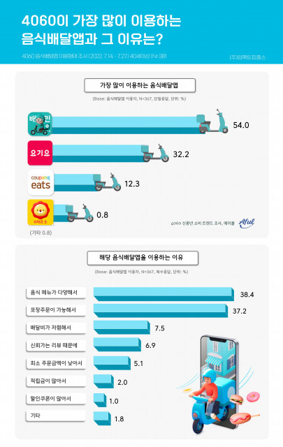 시니어 소셜벤처 임팩트피플스(대표 신철호)가 신중년의 음식 배달 어플리케이션 이용 트렌드 조사를 실시했다고 14일 밝혔다. 임팩트피플스는 에이풀(Aful)을 통해 2022년 7월 14일부터 7월 27일까지 4060 남녀 380명을 대상으로 음식 배달 앱 이용 트렌드 조사를 실시했다. 음식 배달 앱은 음식을 준비하는 번거로움을 대신하고, 집에서 다양한 음식을 편하게 맛볼 수 있다는 이점 덕에 많은 이의 생활 필수 앱(APP)이 됐다. 특히 비대면을 강요 받은 코로나19 상황은 배달 애플리케이션 대중화의 촉매제로 작용했다. 조...