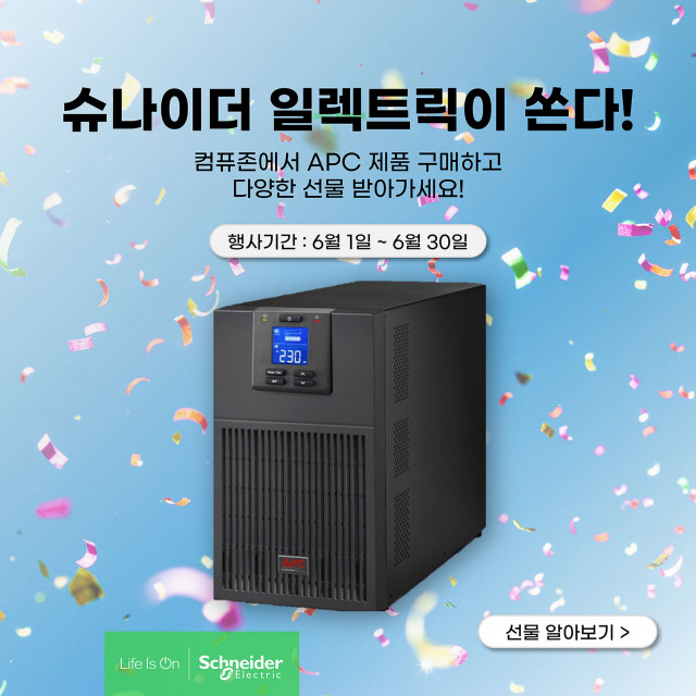 에너지 관리·자동화 분야의 디지털 혁신을 선도하는 글로벌 기업 슈나이더 일렉트릭 코리아(한국지사 대표 김경록)가 6월 온라인 공식 판매처 ‘컴퓨존(compuzone)’에서 무정전 전원장치(UPS) 구매 고객을 대상으로 이벤트를 진행한다. 기상청이 올해 최장 폭염을 예측한 가운데, 올여름 폭염과 불안한 전력망으로 전 세계에 블랙아웃(대규모 정전)이 발생할 수 있다는 경고가 나왔다. 통계청에 따르면, 지난해 재택근무자는 114만 명으로 지난해 대비 2배 이상 급증해 여름철 재택근무 중 갑작스럽게 컴퓨터 전원이 꺼지는 정전 현상이...