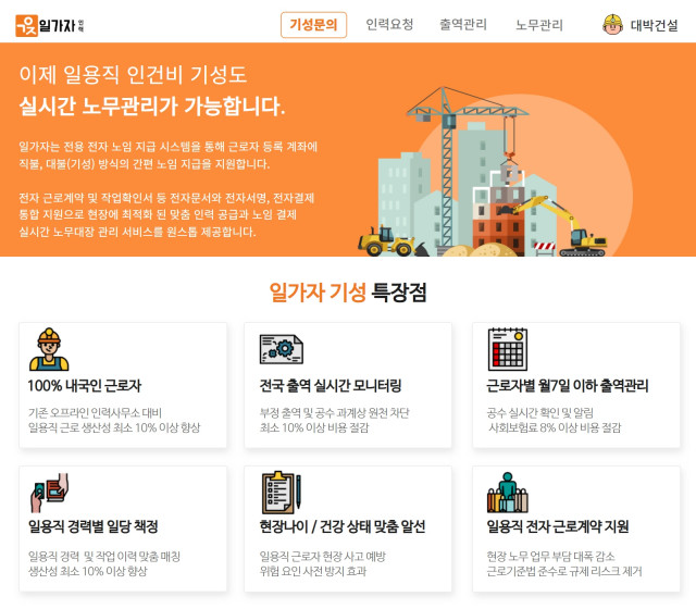 잡앤파트너가 기존 일용직 직불 알선 서비스에 이어 기성(대불) 알선과 프리미엄 고객 서비스인 직불 제휴 서비스를 추가 제공한다고 17일 밝혔다. 이번에 새롭게 시작한 노임 기성(대불) 서비스는 일가자가 먼저 노임을 일용직 반장, 구인처와 재건축, 재개발 사업에 참여하는 전문 건설업체나 인테리어, 물류센터, 철거 등 일용직 구인 업체 및 기업에 선지급하고 후정산하는 방식이다. 일가자는 기존 직업소개소와 다르게 알선 플랫폼과 구인-구직 앱을 활용해 100% 비대면, 온라인 방식으로 기성(대불) 서비스를 제공한다. 직불 제휴 서...