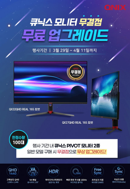IT 전문 기업 큐닉스그룹(대표 차충환)이 QHD 해상도의 REAL 165Hz 모니터 ‘QX27QHD REAL 165 피벗’, ‘QX32QHD REAL 165 피벗’ 게이밍 모니터 2종의 무결점 업그레이드 이벤트를 진행한다. ‘큐닉스 QX27QHD REAL 165 피벗’, ‘큐닉스 QX32QHD REAL 165 피벗’은 각각 27, 32인치 크기의 게이밍 모니터로 QHD (2560X1440) 해상도를 지원한다. REAL 165Hz의 주사율, 1ms(GTG) 응답 속도, 1000:1의 명암비, HDR, 틸트, 피벗, 높낮이 엘리...