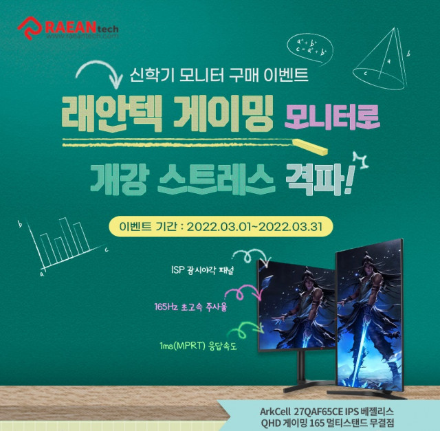 게이밍 모니터 명가 래안텍(대표 신은정)은 3월 신학기 시즌을 기념해 자사 인기 모니터 5종 구매자에게 신세계 지류 상품권을 100% 증정하는 ‘래안텍 게이밍 모니터로 개강 스트레스 격파 신학기 맞이 게이밍 모니터 대상 상품권 증정 이벤트’를 진행한다고 밝혔다. 신학기로 바쁜 3월을 위해 준비된 이번 이벤트는 3월 1일부터 31일까지 한 달간 진행된다. 이벤트 안내가 게재된 온라인 판매처를 통해 이벤트 대상 모니터를 구매하면 신세계 지류 상품권 5000원권을 즉시 받을 수 있다. 이벤트 대상 제품은 총 5종으로 △165Hz ...