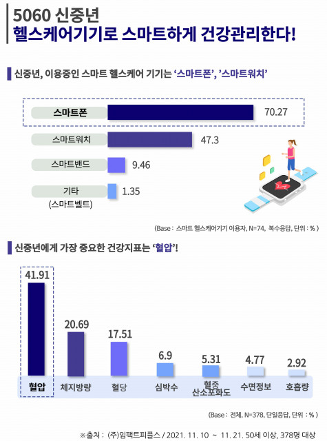 시니어 소셜벤처 임팩트피플스(대표 신철호)가 5060세대의 스마트 헬스케어 기기 트렌드 현황을 조사했다. 임팩트피플스는 에이풀(Aful)을 통해 11월 10일부터 11월 21일까지 50세 이상 378명을 대상으로 조사한 결과, 응답한 신중년의 60.85%가 헬스케어 기기를 이용한 건강관리에 긍정적인 반응인 것으로 나타났다. 이용 중인 헬스케어 기기를 묻는 질문(N=74)에는 스마트폰이 70.27%, 스마트워치 47.3%, 스마트밴드 9.46%로 뒤를 이었다. 이들이 기기를 통해 얻는 신체 정보는 걸음 수 87.84%, 소모 ...