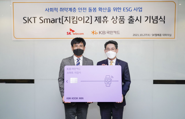 SK텔레콤(대표이사 박정호)은 KB국민카드(사장 이동철)와 손잡고 사회 취약 계층 안전 돌봄 서비스인 ‘스마트지킴이2’를 활용한 ESG 특화 상품인 ‘KB국민 스마트 지킴이 카드’를 27일 출시했다고 밝혔다. 양사는 이날 SK 남산 사옥에서 출시 기념식을 하고 SKT의 IoT 기반 웨어러블 위치확인 장비인 스마트 지킴이2 관련 다양한 혜택을 담은 KB국민 스마트 지킴이 카드가 취약 계층의 안전 돌봄 서비스 이용 편의를 높이고, 안전 돌봄에 대한 사회적 관심을 높이는 데 도움이 될 것으로 기대했다. SKT 스마트지킴이2는 치매...