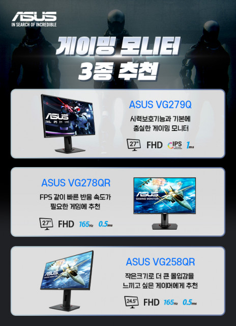 글로벌 컴퓨팅 전문 기업 ASUS의 한국 지사인 에이수스 코리아(지사장: 강인석, 이하 ‘에이수스’)는 에이수스만의 다양한 게이밍 기술을 갖춘 게이밍 모니터 3종이 게이머들의 눈길을 끌고 있다고 밝혔다. VG279Q는 27인치 크기와 FHD 해상도, IPS 패널, 1ms 응답속도 등 기본에 충실한 게이밍 모니터다. 빠른 응답속도로 움직이는 장면에서 화면이 흐리게 변하는 블러 현상을 최소화해주는 ‘익스트림 로우 모션 블러(ELMB)’ 기능을 탑재했다. 이외에도 섀도우 부스트로 어두운 영역을 잘 보이게 해주며, 프리싱크 기능을 탑...