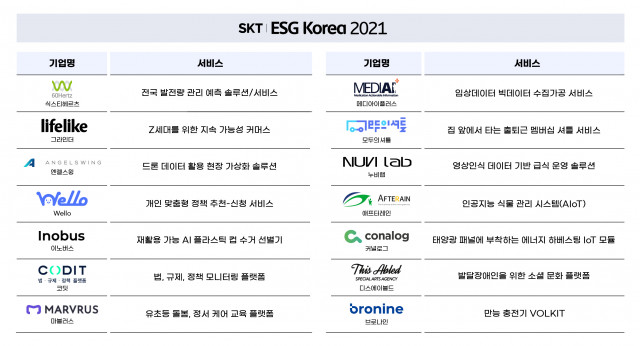 SK텔레콤(대표이사 박정호)은 ‘ESG 코리아 2021(ESG Korea 2021)’ 얼라이언스 워크숍을 8월 31일 개최해 육성 중인 14개 혁신 스타트업들과 함께 사회문제 해결을 위한 ESG 경영방안을 모색했다고 1일 밝혔다. ‘ESG 코리아 2021’ 얼라이언스(이하 ESG 얼라이언스)는 ESG 분야 스타트업들의 도전과 성장을 돕기 위해 국내외 기업, 사회적기업가 교육 기관, 투자사들이 참여하는 연합체다. SKT와 마이크로소프트, SAP, 소풍벤처스, HGI, 벤처스퀘어, 미라클랩, MYSC, SK사회적기업가센터, SBA...