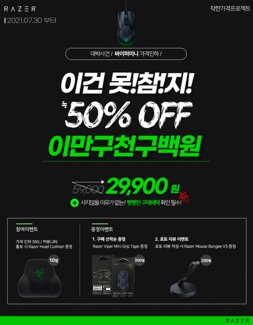 글로벌 게이밍 라이프 스타일을 주도하는 브랜드 레이저(RAZER)에서 게이밍 마우스 ‘Razer Viper Mini’ 제품에 대한 착한 가격 프로젝트를 실시한다고 밝혔다. 레이저 공식 국내 수입유통사 웨이코스는 레이저 고객들에게 감사한 마음을 전하고자 RAZER 대표 상품을 선정해 착한 가격 프로젝트를 실시하고 있다. 이번 프로젝트 대상 제품은 RAZER 게이밍 마우스 중 컴팩트한 크기와 가벼움으로 인기 있는 ‘Razer Viper Mini’ 마우스로, 50% 가격 인하된 2만9900원에 제공하는 이벤트다. 30일부터 레이...