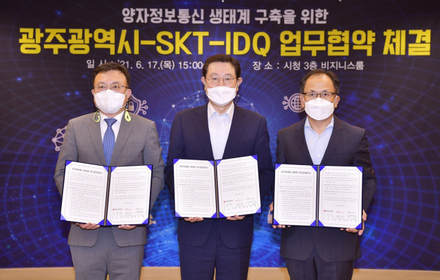 SK텔레콤(대표이사 박정호)은 광주광역시(시장 이용섭), IDQ코리아(공동대표 하민용)와 함께 광주시가 추진하는 R&D, 공공·행정 분야에 양자기술을 공급하고 양자정보통신 생태계 조성 등에 협력하는 내용의 업무 협약(MOU)을 체결했다고 17일 밝혔다. 광주시청에서 열린 이날 협약식에는 이용섭 시장과 SKT 조영록 CR 성장지원실장, IDQ코리아 하민용 공동대표 등이 참석했다. 5월 한미정상회담에서도 양국 간 양자 분야 협력이 논의되는 등 국내외에서 양자기술에 관한 관심이 높아지고 있는 가운데 이날 양측 협력 발표가 국내 ...