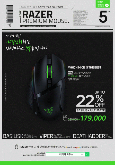 글로벌 게이밍 라이프스타일을 주도하는 브랜드 레이저(RAZER)에서 프리미엄 게이밍 마우스 제품들에 대한 착한 가격 프로젝트 행사를 실시한다. RAZER 국내 공식독점 수입유통사 웨이코스는 레이저 고객들에게 감사하는 마음을 담아 게이밍 마우스 7종의 가격 인하를 실시한다고 밝혔다. 이번 착한 가격 프로젝트 대상 품목은 RAZER Basilisk Ultimate와 Viper Ultimate 시리즈를 비롯한 프리미엄 무선마우스 6종과 DeathAdder V2 유선마우스 1종으로 최대 22% 인하된 가격으로 구매할 수 있다. 자세...