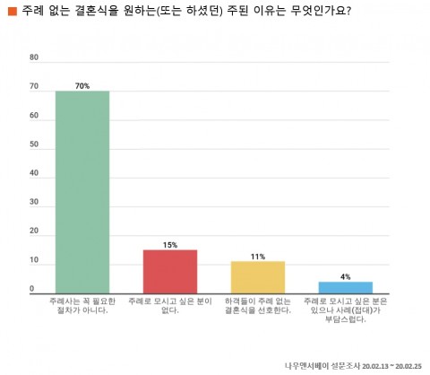 기혼자 중 주례 있는 결혼식을 했거나, 미혼자 중 주례 없는 결혼식을 선택한 응답자에게 ‘주례 없는 결혼식을 원하는(또는 하셨던) 주된 이유는 무엇인가요?’에 대하여 질문한 결과 ‘주례사는 꼭 필요한 절차가 아니다(70%)’가 가장 많은 응답을 차지하였고, 그 다음으로 ‘주례로 모시고 싶은 분이 없다(15%)’, ‘하객들이 주례 없는 결혼식을 선호한다(11%)’, ‘주례로 모시고 싶은 분은 있으나 사례(접대)가 부담스럽다(4%)’ 순으로 나타났다.