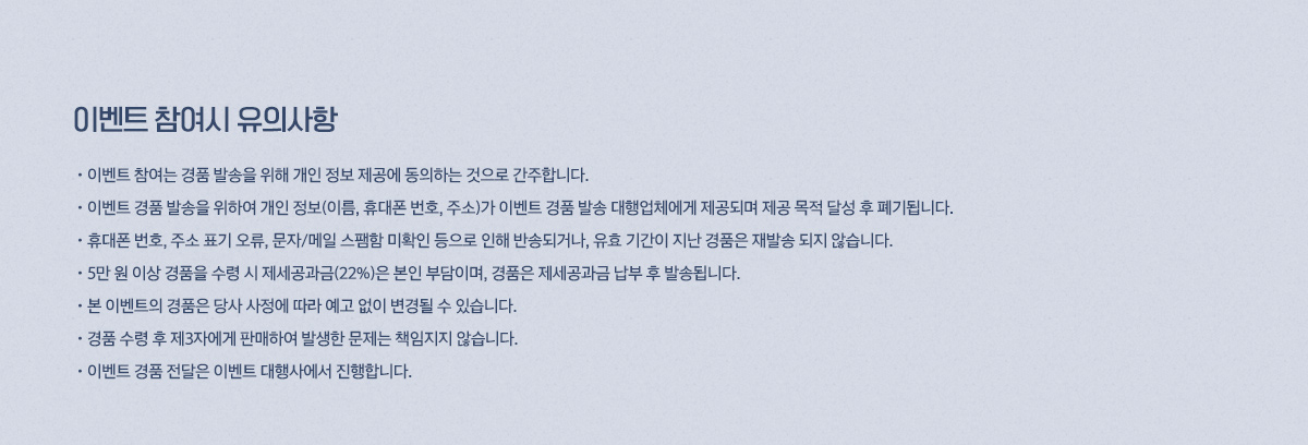 - 5만원 초과 경품을 수령 시 제세공과금(22%)은 본인 부담이며, 경품은 제세공과금 납부 후 발송됩니다.
